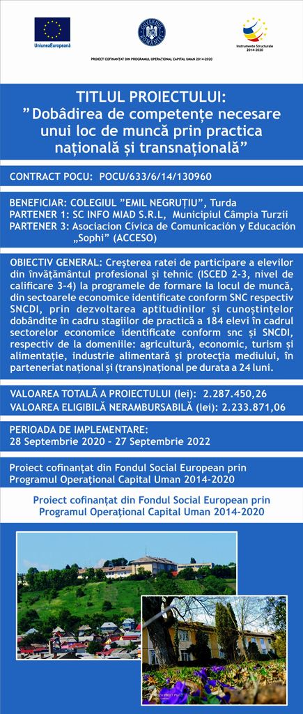 Colegiul ”Emil Negrutiu”, Turda Strada Agriculturii, nr. 27 telefon: 0264/312637 fax:0264/317051 e-mail: emilnegrutiu@yahoo.com www.emilnegrutiu.ro http://pocu130960.emilnegrutiu.ro/